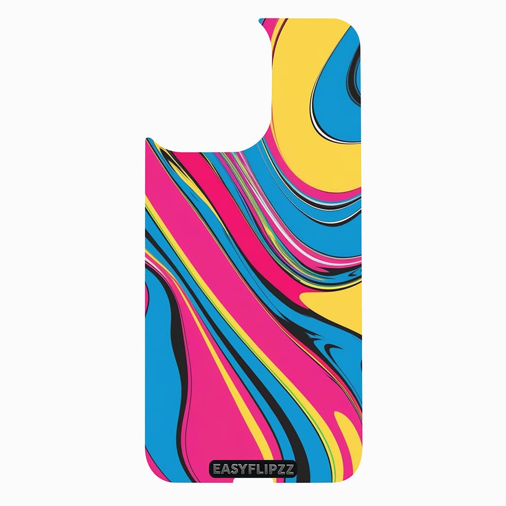 Backflipzz 02 DP Digital Paint PinkBlue voor Apple iPhone. Opvallende swirl in roze, blauw en geel. Luxe vinyl, haarscherp digitaal bedrukt en snel te wisselen met Chameleon Pro.